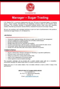 Join the C.W. Mackie PLC team! We're seeking a Manager for our Sugar Trading division. This is an excellent opportunity...