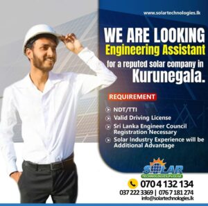 We are looking Engineering Assistantfor a reputed solar company in Kurunegala. REQUIREMENT:- ✅NDT/TTI✅Valid Driving License✅Sri Lanka Engineer Council Registration Necessary✅Solar...