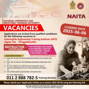 Deadline:- 06th June 2025 Company:- Japan Tec location:- Orugodawatta Build your successful future career life with us…. Please submit your...