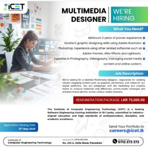 Deadline:- 31st May 2025 We're Hiring – Multimedia Designer✅ Salary: LKR 75,000.00✅ Min 02 Years of Proven Experience✅ Photoshop, Illustrator,...