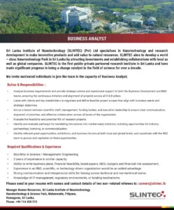 Deadline:- 29th May 2025 CAREER OPPORTUNITY: Business Analyst at SLINTEC Join Sri Lanka's leading nanotechnology institute! We're seeking a qualified...