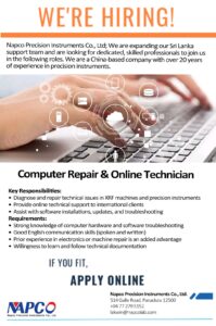 Deadline:- 31st May 2025 Company:-Napco Precision Instruments co ltd Location:- Panadura Send your CV:- lakwin@napcolab.com Diagnose technical issues in XRF...