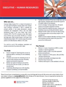 Deadline:- 13th June 2025 Company:- Overseas Realty (Ceylon) Pvt ltd We're Hiring: HR Executive Location: WTC Full-Time ▷ Apply now...