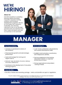 Deadline:- 20th June 2025 Company:- Life Skill Academy Send your CV :- training@lifeskillacademy.lk Corporate Training Solutions and individual development program