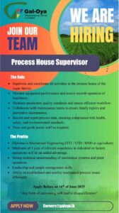 Deadline:- 16th June 2025 WE ARE HIRING - Process House Supervisor! Gal-Oya Plantations (Pvt) Ltd is seeking a dynamic and...
