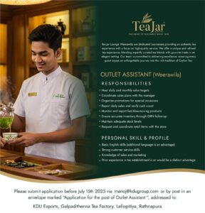 Deadline:- 15th July 2025 🍃 We're Hiring – Outlet Assistant ,Tea Jar by the Lake (Weerawila) Join with Tea Jar...