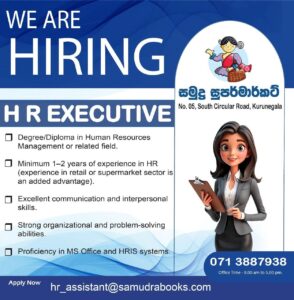 Deadline:- 10th July 2025 Company:- Samudra Super market Send your CV:- hr_assistant@samudrabooks.com Location:- Kurunegala Sri lanka Human Resources job vacancy