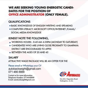 Deadline :- 12th July 2025 Vacancy available for Office Administrator (Only female). Please email or WhatsApp your CVautobackseight@gmail.com071 466 8888...