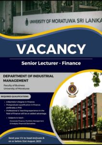 Deadline:- 31st August 2025 Vacancy for a Senior Lecturer - Finance. Send your CV before 31st August 2025 to: head-im@uom.lk...