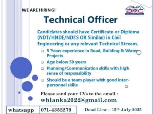 Deadline:- 15th July 2025 Company:- BMC Group Send your CV :- wblanka2022@gmail.com Location:- Girandurukotte Road, Yaya kotasa, Bathalayaya, Aluththarama90700 Mahiyangana,...