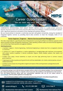 Deadline:- 15th July 2025 Hambantota International port group Pvt ltd Career Opportunities….. Senior Engineer/Engineer - Marine Services and Fleet Management...