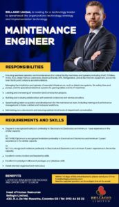 Deadline:- 22nd July 2025 company:- Bellagio Limited Send your CV - hrm@bellagiocolombo.com Sri Lanka engineering job vacancy Apply online
