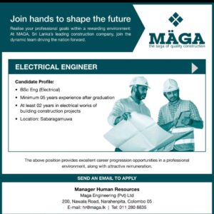 Deadline :- 17th July 2025 Company:- Maga engineering Sabaragamuwa Ratnapura Send your CV :- hr@maga.lk Sri Lanka engineering job vacancy