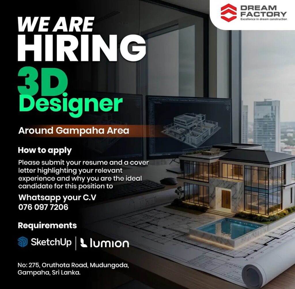 We are Hiring 3D Designers around Gampaha Area with Minimum 2+ Years of Experience.