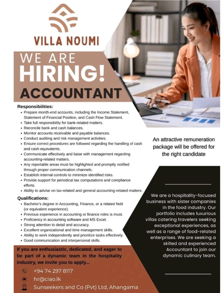 Villa Noumi, part of our hospitality-focused group with ventures in the food industry, is looking for a skilled and experienced Accountant to join our dynamic team in Ahangama.