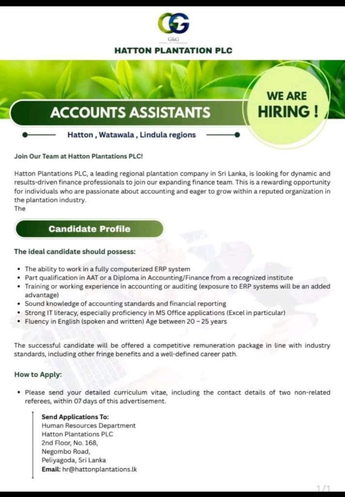 Hatton Plantations PLC, a leading regional plantation company in Sri Lanka, is looking for dynamic and results-driven finance professionals to join our expanding finance team. This is a rewarding opportunity for individuals who are passionate about accounting and eager to grow within a reputed organization in the plantation industry.
