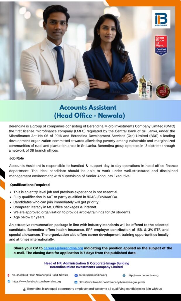 Finance and Accounts Accounts Assistant 1 hour ago Deadline :- 12th March 2026 Company:- Berendina Location:- Nawala, Colombo Apply now :- careers@berendina.org Post navigation Previous: Digital Marketing Executive/ Technical Sales Officer/ Customer Relationship OfficerNext: Project Coordinator Related Vacancies Finance and Accounts Accounts Executive 8 hours ago Finance and Accounts Internship Internship – Finance 1 day ago Finance and Accounts Sales and Marketing Finance Executive/ Sales Assistant 2 days ago