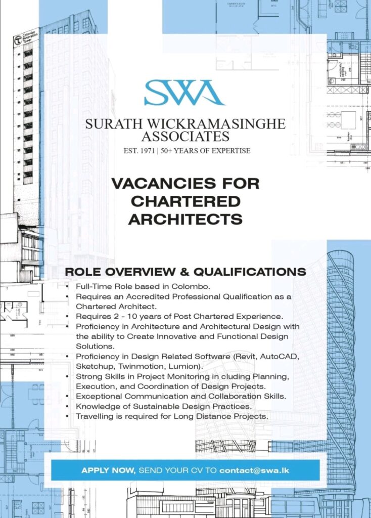 Architect Architect 15 seconds ago Deadline :- 20th January 2026 Company:- SWA Associates Apply Now :- contact@swa.lk Post navigation Previous: Executive – HR & Administration Related Vacancies Architect Graduate Architect 2 days ago Architect Draughtsman Junior Interior Designer 5 days ago Architect Interior Designer 1 week ago