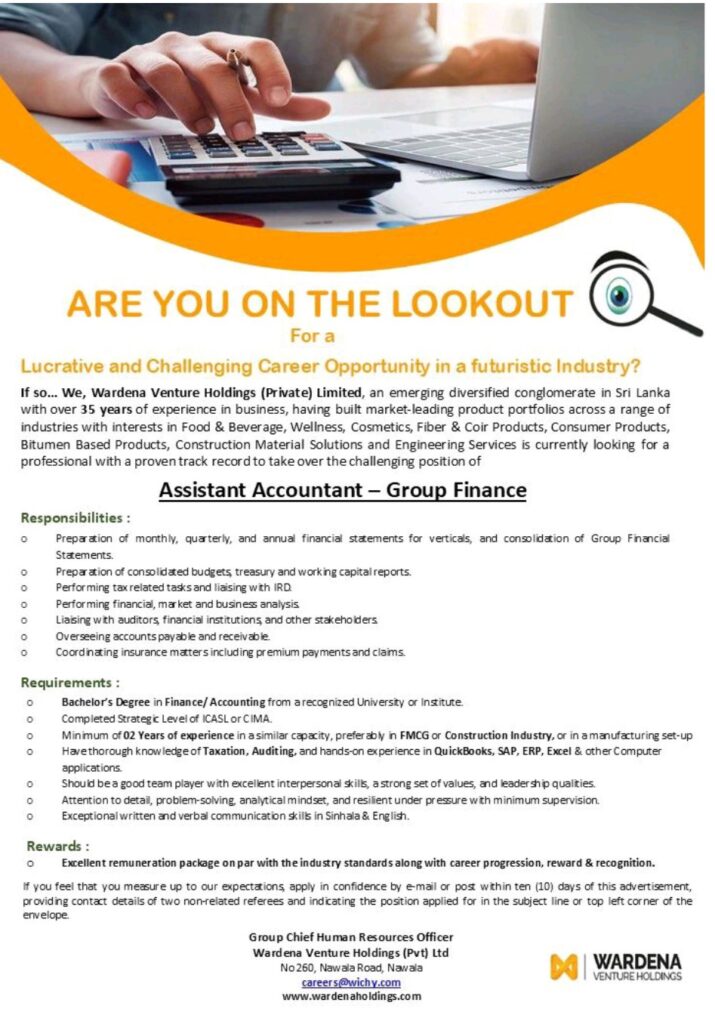 Wardena Venture Holdings (Pvt) Ltd, a leading diversified conglomerate with over 35 years of excellence, is on the lookout for a dynamic and passionate professional to join our team as an Assistant Accountant Group Finance.