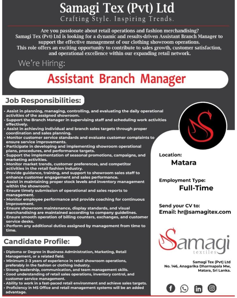 Samagi Tex (Pvt) Ltd is looking for a dynamic and results-driven Assistant Branch Manager to support the daily operations of our clothing showroom in Matara. This role offers an excellent opportunity to contribute to sales growth, team leadership, and customer experience within our expanding retail network.