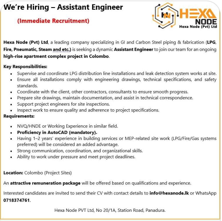 Interested candidates are invited to send their CV with contact details to info@hexanode.lk or WhatsApp 0718374761.