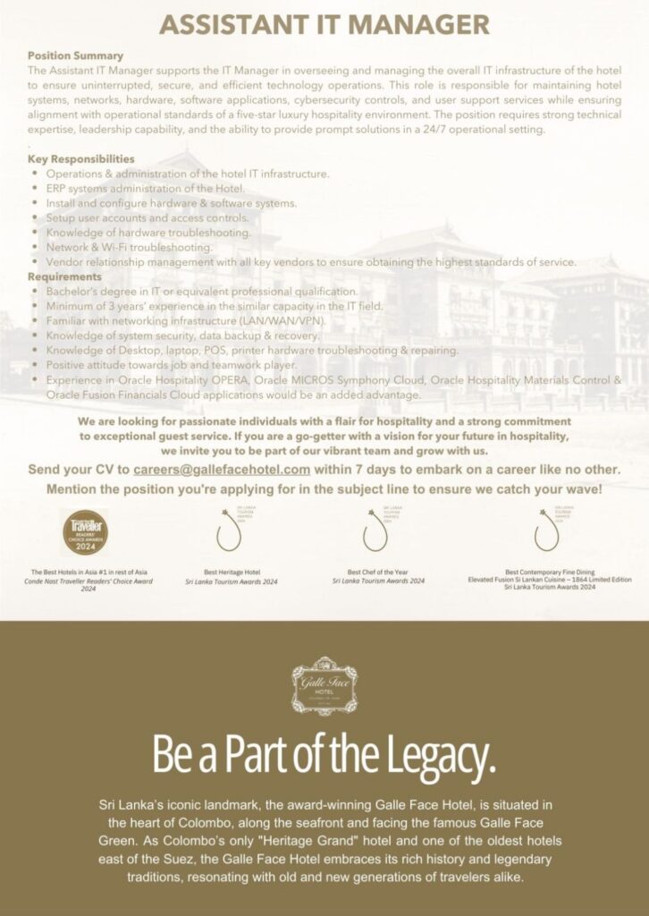 We are pleased to announce exciting career opportunities at the iconic Galle Face Hotel, Colombo. As one of Sri Lanka’s most prestigious heritage hotels, we are seeking passionate, dedicated, and service-oriented professionals to join our team.