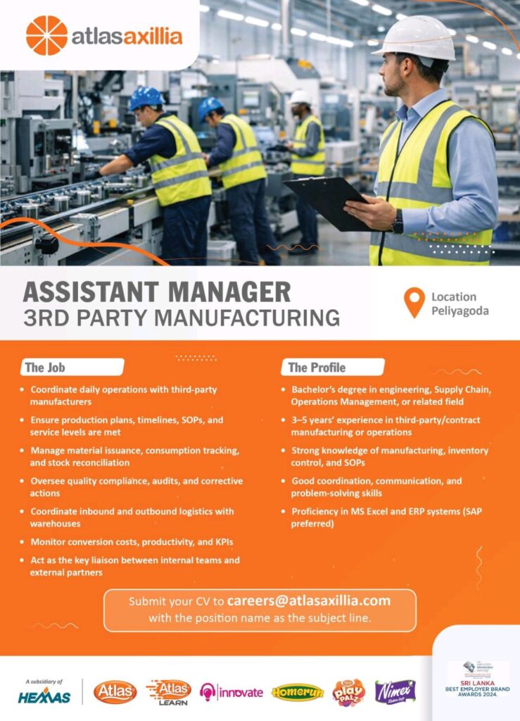 Atlas Axillia is on the lookout for an Assistant Manager 3rd Party Manufacturing to join our team based in Peliyagoda.