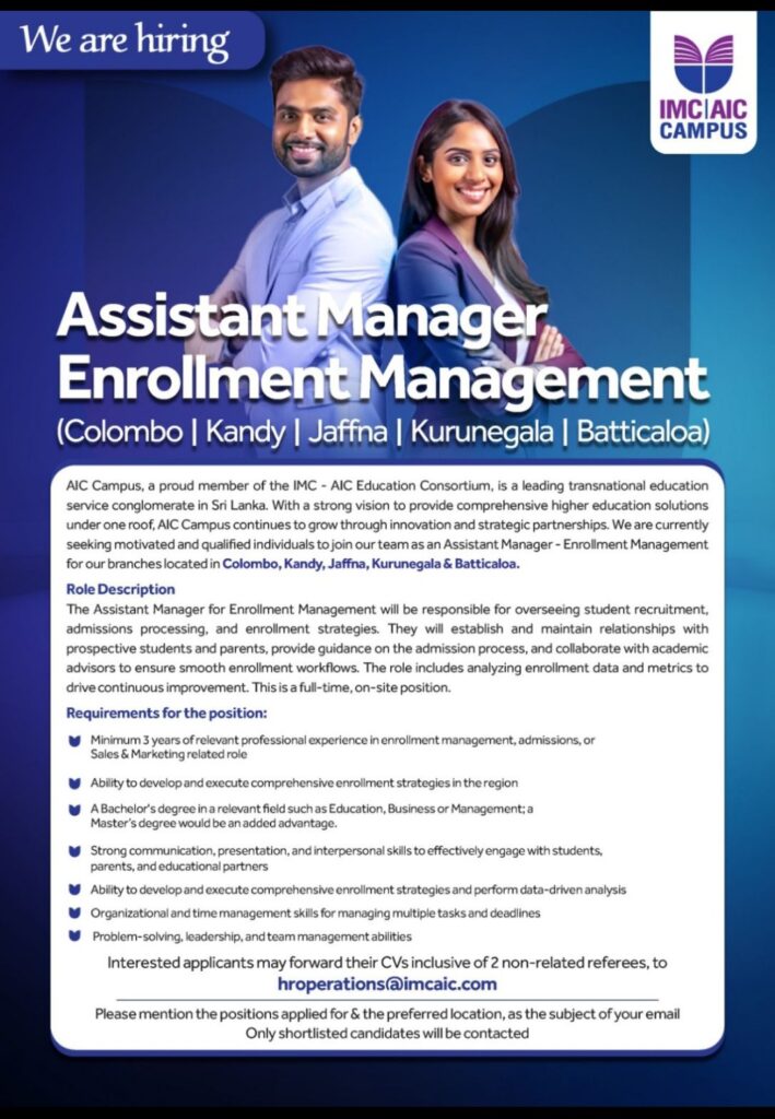 We’re looking for Assistant Managers – Enrollment Management across Colombo, Kandy, Kurunegala, Jaffna & Batticaloa.