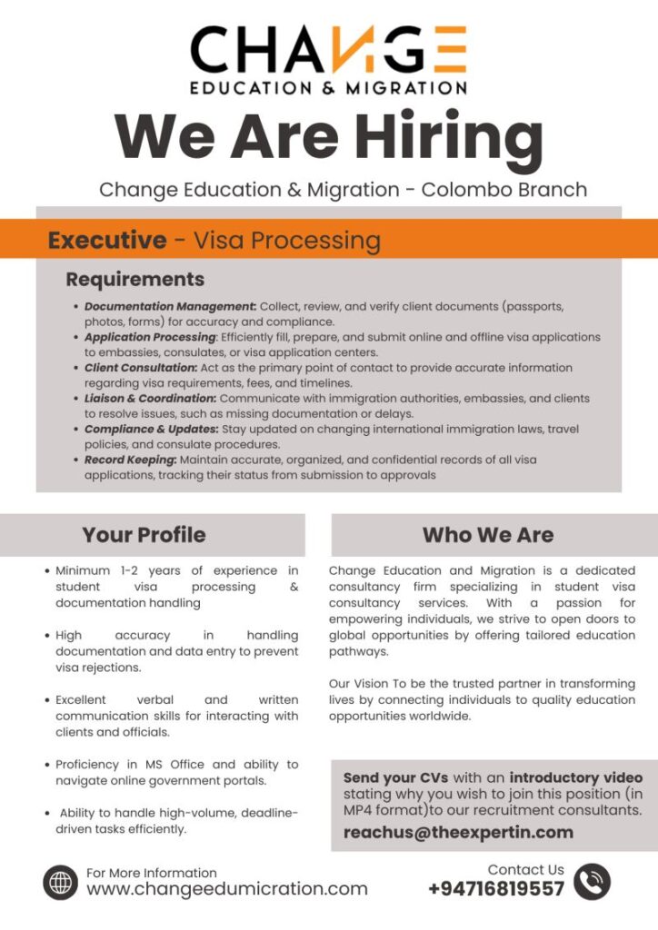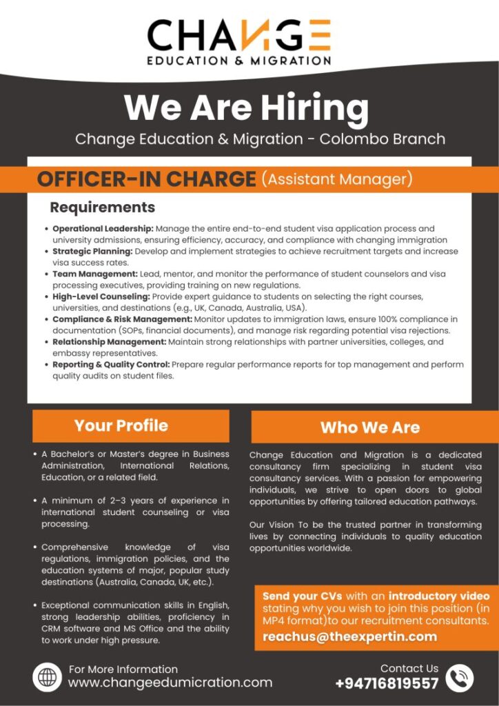 Change Education & Migration is expanding its Colombo Branch, and we are looking for passionate, driven professionals to join our team. If you have a background in international education and a commitment to transforming lives through global opportunities, we want to hear from you. We are currently hiring for two key roles:
