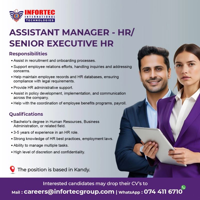 We are looking for a dedicated and experienced professional to join us in Kandy as an Assistant Manager – HR or Senior Executive HR.