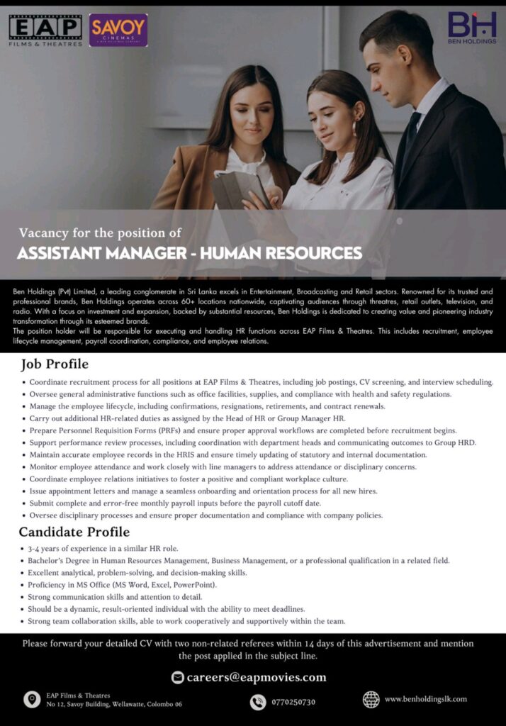 Join the team behind Sri Lanka’s iconic entertainment brand EAP Films & Theatres! We’re looking for a driven and detail-oriented Assistant Manager – HR to lead core HR functions including recruitment, payroll, compliance, and employee relations.