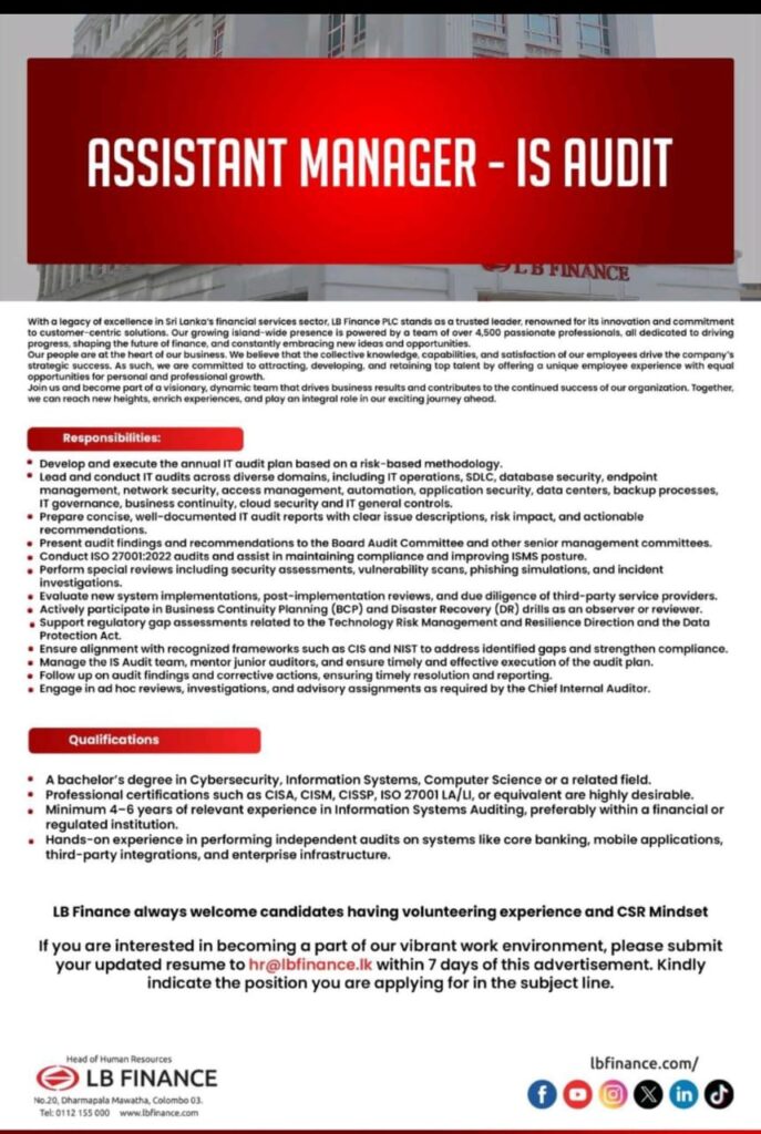 Send your resume to hr@lbfinance.lk within 7 days and mention the position in the subject line. Be part of a visionary workplace that values innovation, integrity, and growth!