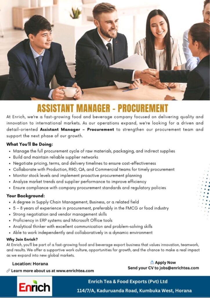 Join our fast-growing team at Enrich Tea & Food Exports (Pvt) Ltd as an Assistant Manager Procurement.