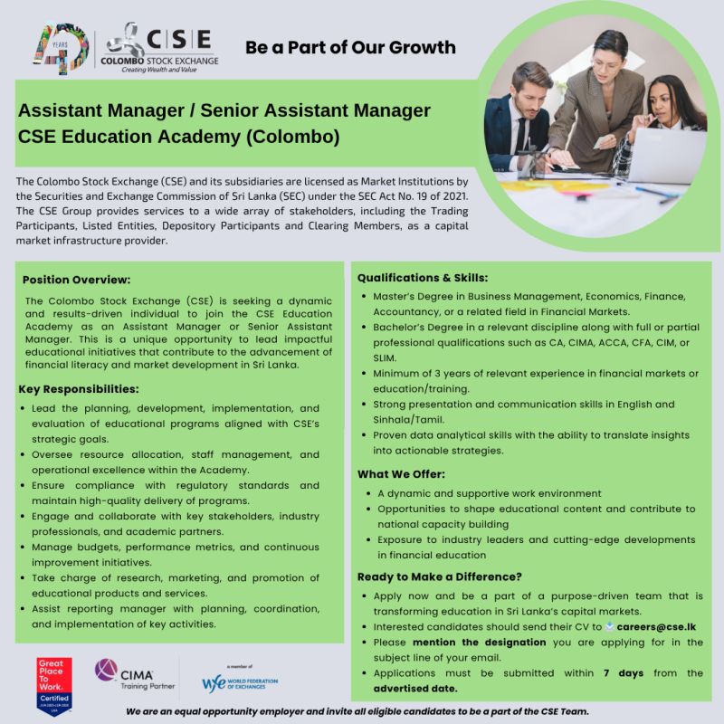 Job Position – Assistant Manager / Senior Assistant Manager -CSE Education Academy We are seeking ambitious individuals to apply for the position of an Assistant manager / Senior Assistant Manager -CSE Education Academy .