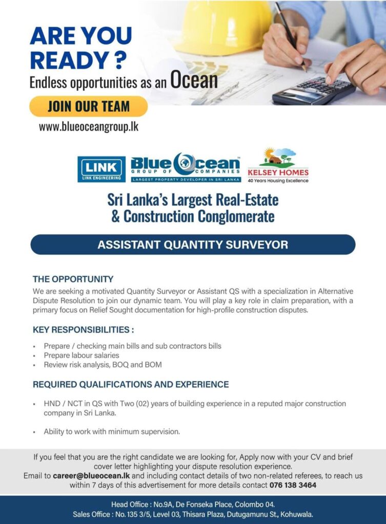Blue Ocean Group of Companies — Sri Lanka’s Largest Real-Estate & Construction Conglomerate 🌊🏗️ — is expanding its technical team and invites qualified professionals to apply for the position of:
