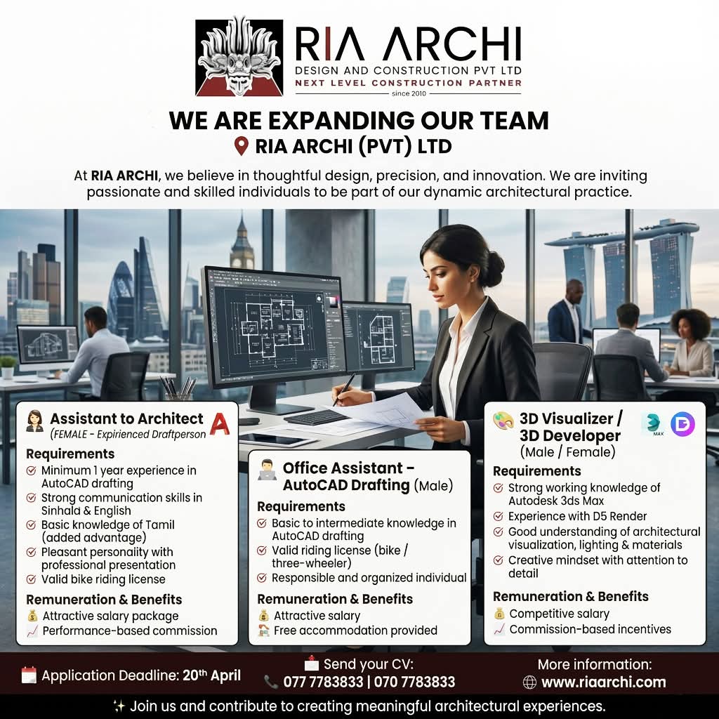 3D Designer Draughtsman Engineering Assistant to Architect/ Office Assistant/3D Visualizer 3 hours ago Deadline:- 20th April 2026 Company:- RIA Archi Pvt ltd Apply Now :- 0777783833 AutoCAD Drafting Post navigation Previous: Banking TraineeNext: Executive – Sales/ Marketing/Accounts/ Operations Related Vacancies Engineering IT Jobs PhD Studentship CSE 8 hours ago Engineering Supervisor Site Supervisor 1 day ago Business Administration Engineering Food Science Production Executive Production Executive 1 day ago