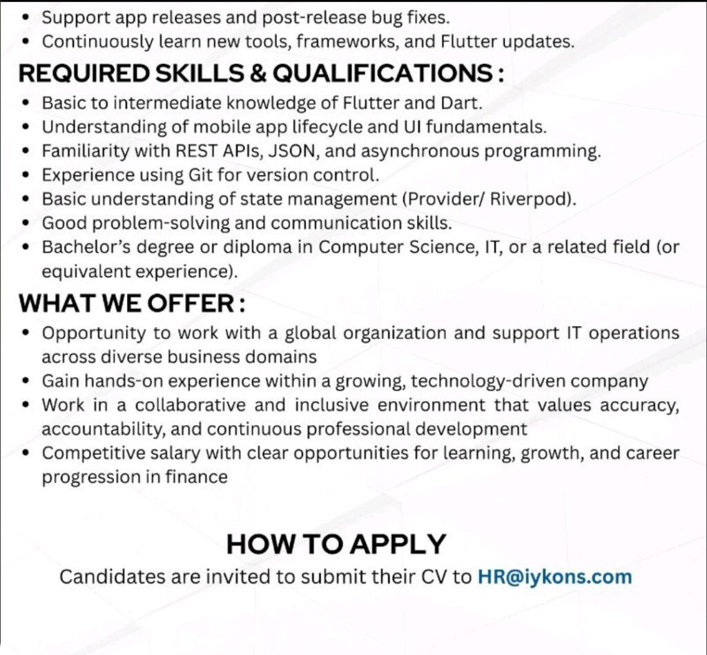 If you have a strong understanding of Flutter fundamentals and are eager to work on live production applications, this is a great opportunity to grow your career while working with experienced developers in a collaborative environment.