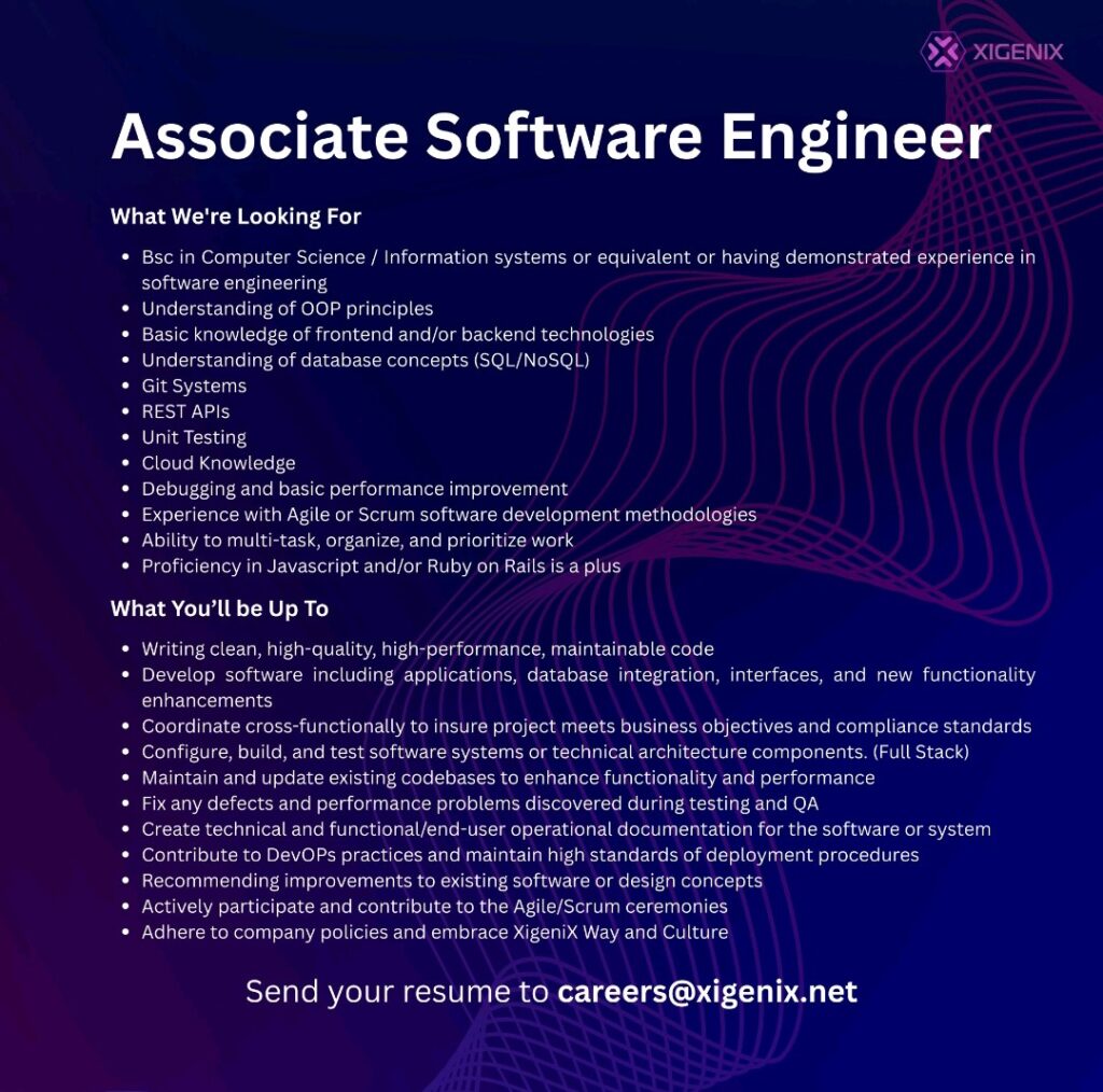 XigeniX is hiring an Associate Software Engineer who’s ready to write clean code, solve real-world problems, and grow with a dynamic, cross-functional team.
