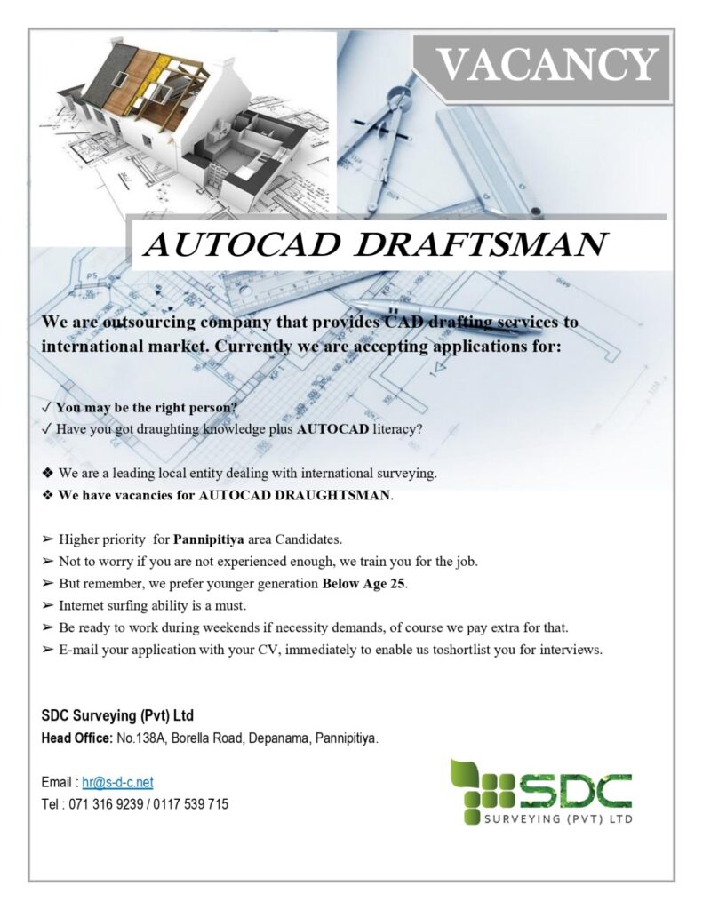 Draughtsman Engineering AUTOCAD Draftsman 1 hour ago Deadline :- 5th January 2026 Company:- SDC Surveying Location:- Pannipitiya Apply now :- hr@s-d-c.net Post navigation Previous: DraftsmanNext: Accounts Assistant Related Vacancies Engineering Civil Engineer 2 minutes ago Engineering Electrical Engineer 6 minutes ago Draughtsman Engineering Draftsman 1 hour ago