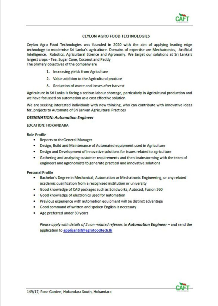 Please apply with details of 2 non-related referees to Automation Engineer – and send the application to applicantsf@agrofoodtech.lk