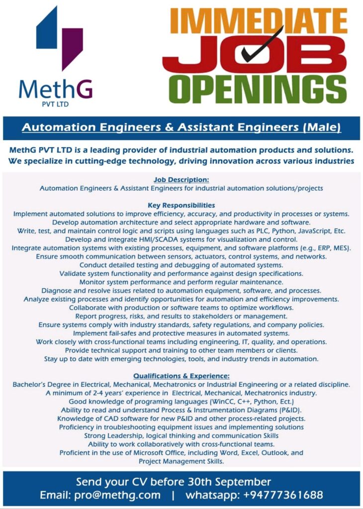 We’re hiring! MethG (Pvt) Ltd is looking for Technical Professionals to join our growing team. If you’re passionate about Automation, we’d love to hear from you!