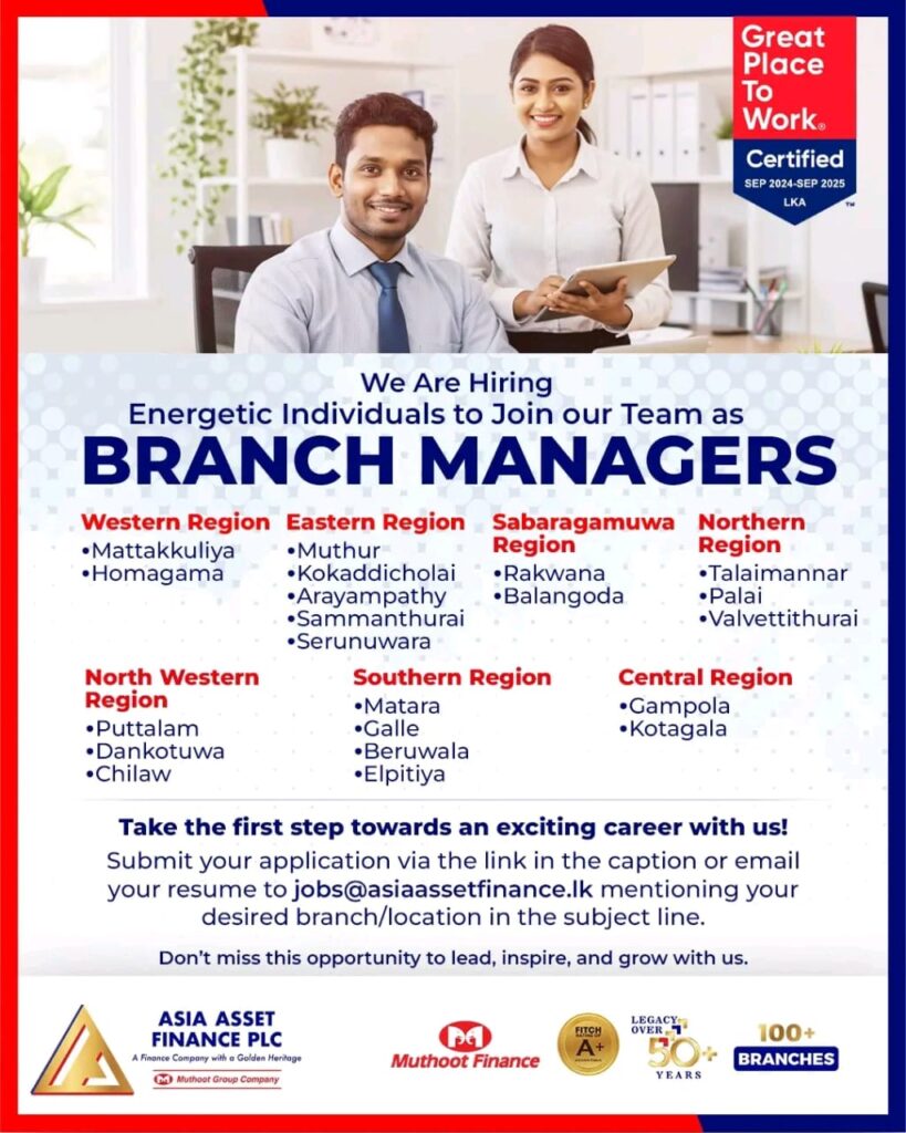 Asia Asset Finance PLC, part of the prestigious Muthoot Group, is expanding and seeking dynamic, motivated individuals to lead our Branches.