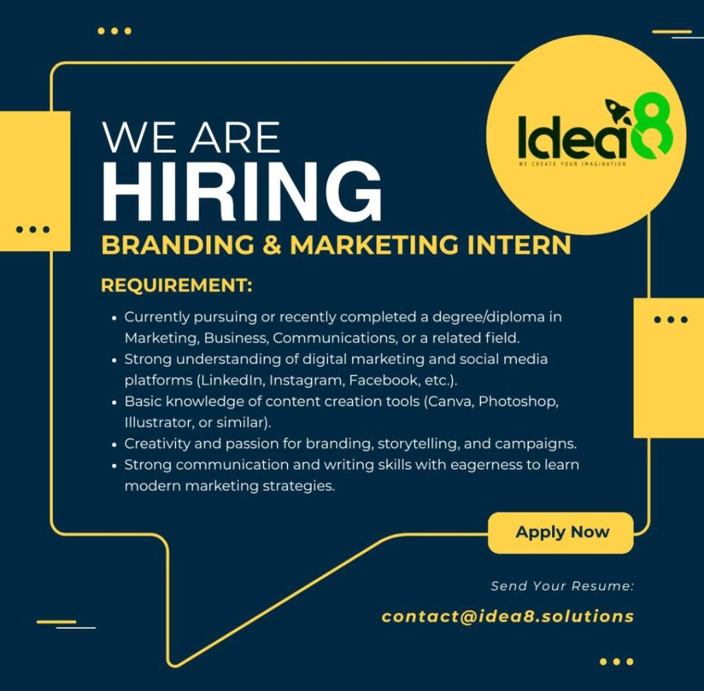 Send your CV to contact@idea8.solutions with the subject line as the position you’re applying for (e.g., Branding & Marketing Intern).