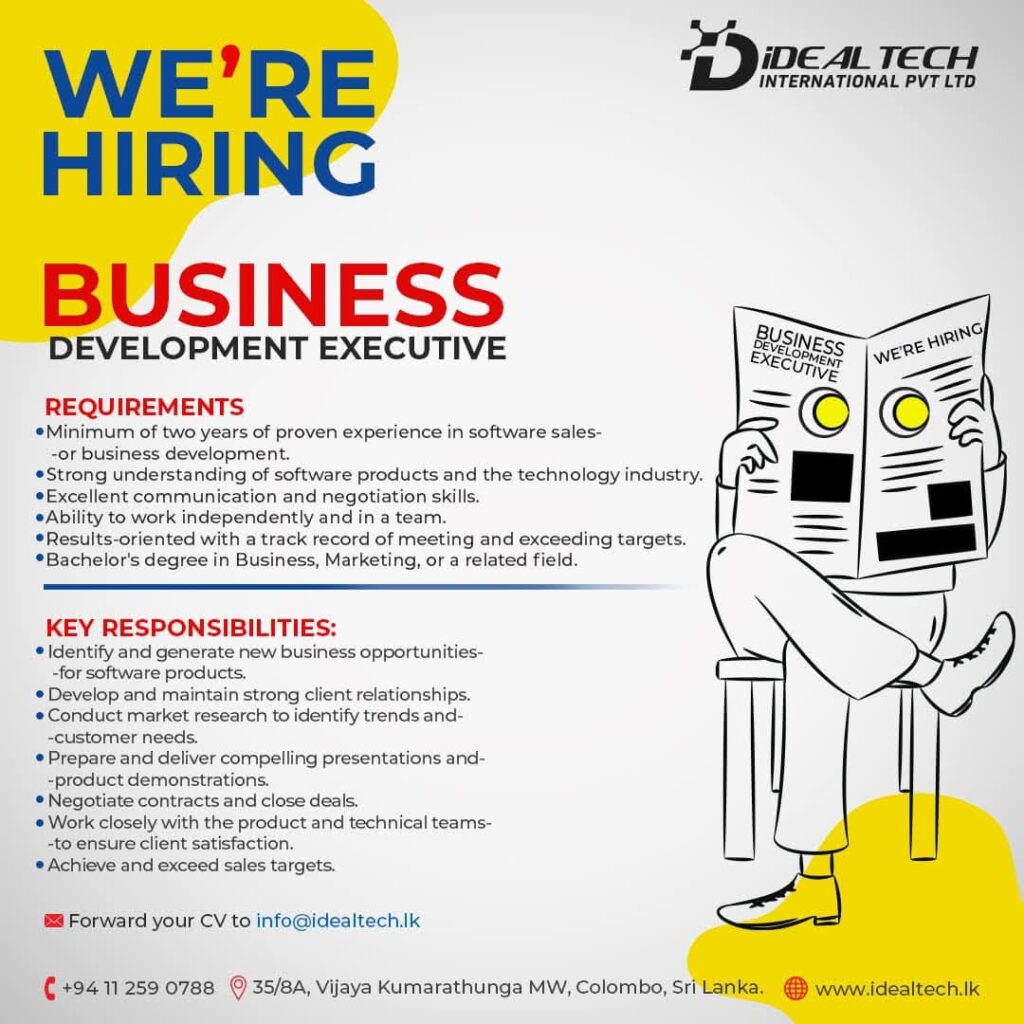 Sales and Marketing Business Development Executive 10 months ago Company:- Idealtech international Pvt ltd Send your CV :- info@idealtech.lk Colombo Job Vacancy Post navigation Previous: Computer OperatorNext: Financial Consultant Related Vacancies Internship IT Jobs Sales and Marketing Internship – Frontend Developer/ Marketing / Management 3 days ago Sales and Marketing Sales Executive 3 days ago Sales and Marketing Marketing & Branding Executive 4 days ago