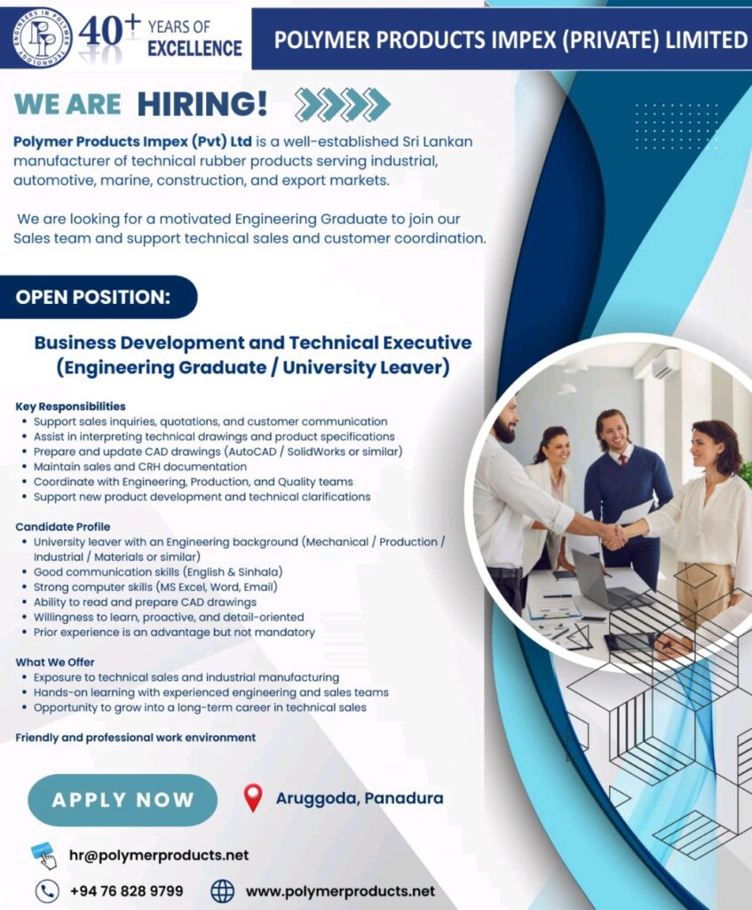 Polymer Products Impex (Private) Limited is looking for an Engineering Graduate / University Leaver to join our team and support business development, technical sales, and customer coordination.