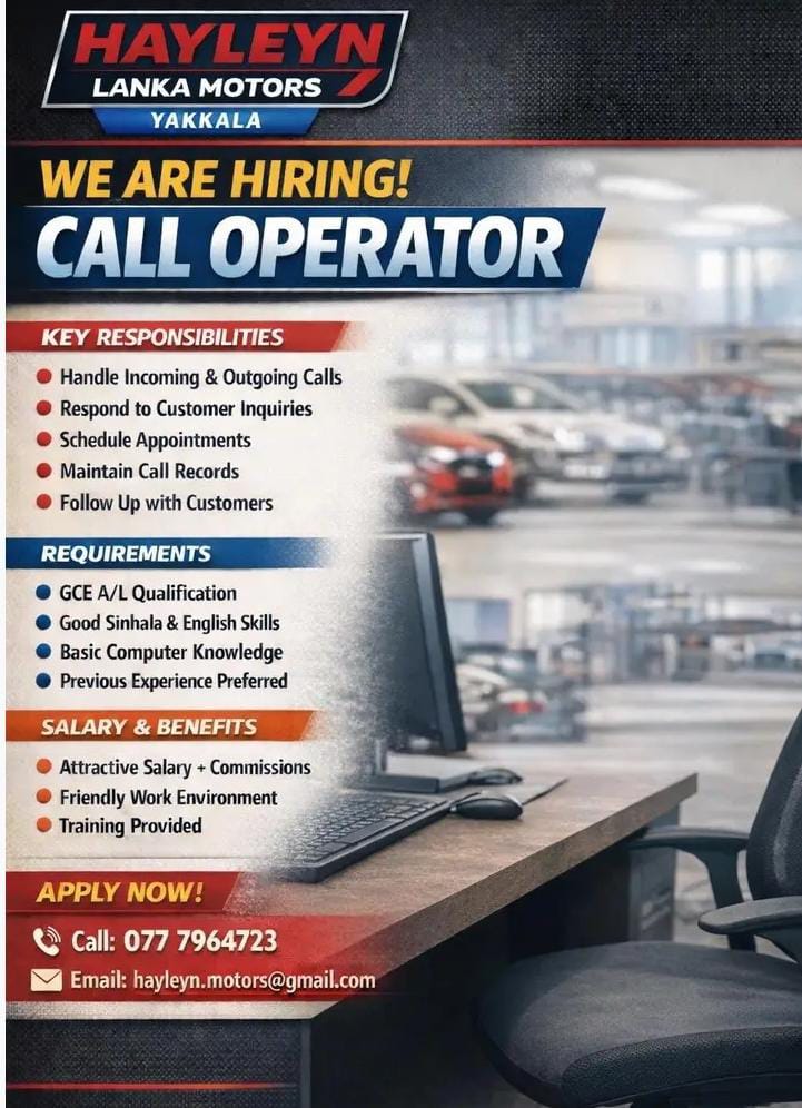 Hayleyn Lanka Motors is looking for a friendly, well-spoken, and responsible Call Operator to handle incoming and outgoing calls related to vehicle inquiries, appointments, and customer support. The ideal candidate should have good communication skills and a customer-focused attitude.