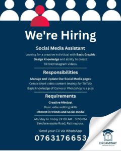 Deadline :- 15th October 2025 🟧 Social Media Coordinator – Female | Full-time | Matale Requirements• Fluent in English• 1–2...