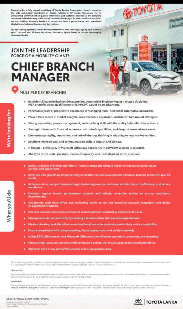 Join Toyota Lanka as a Chief Branch Manager and take the wheel in shaping the future of mobility across Sri Lanka.