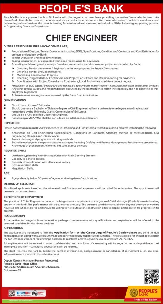 People’s Bank is looking for a talented and dynamic individual to fill the supporting position of Chief Engineer in the Engineering Services Department.