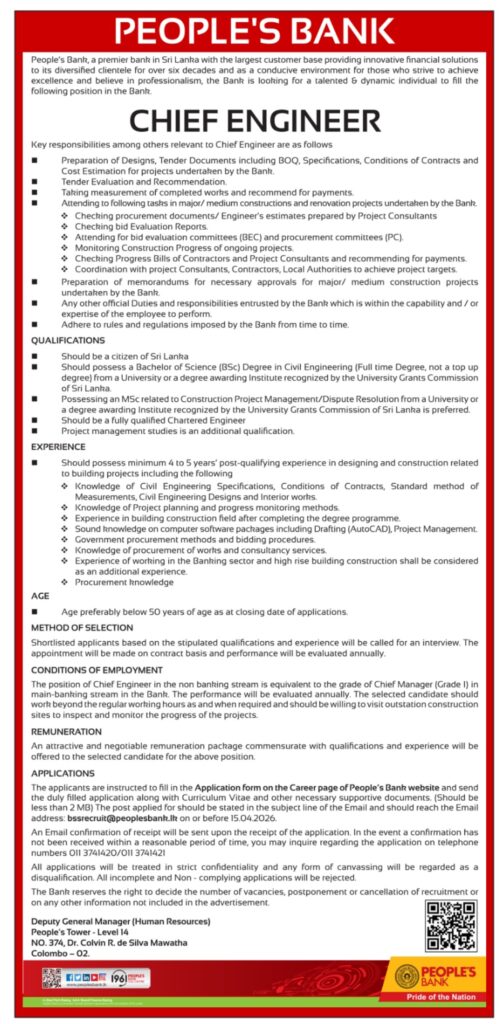 People’s Bank is seeking dynamic, high-potential individuals to join our team as Chief Engineer.